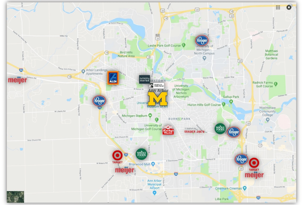 Small grocery stores and small boutiques are located within walking distance to campus and downtown Ann Arbor. Larger stores, such as Meijer, Target, Trader Joe’s, Whole Foods, and Briarwood Mall, are accessible by AATA bus and will have discounted prices on a variety of products. Lucky’s Market is the closest main grocer within walking distance of Central Campus (approximately 20 minutes from Ross). You can also opt to order groceries online and have them delivered via services such as InstaCart, Shipt, or Delivice.Â