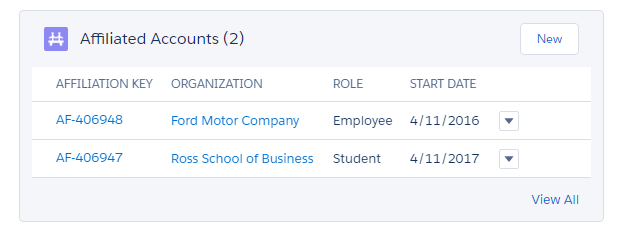 For example, a contact can have an affiliation with the Ford Motor Company account as a former employee, as well as have an affiliation with the Ross School of Business account as a current student. This would be presented as 2 affiliations tied to one contact record.