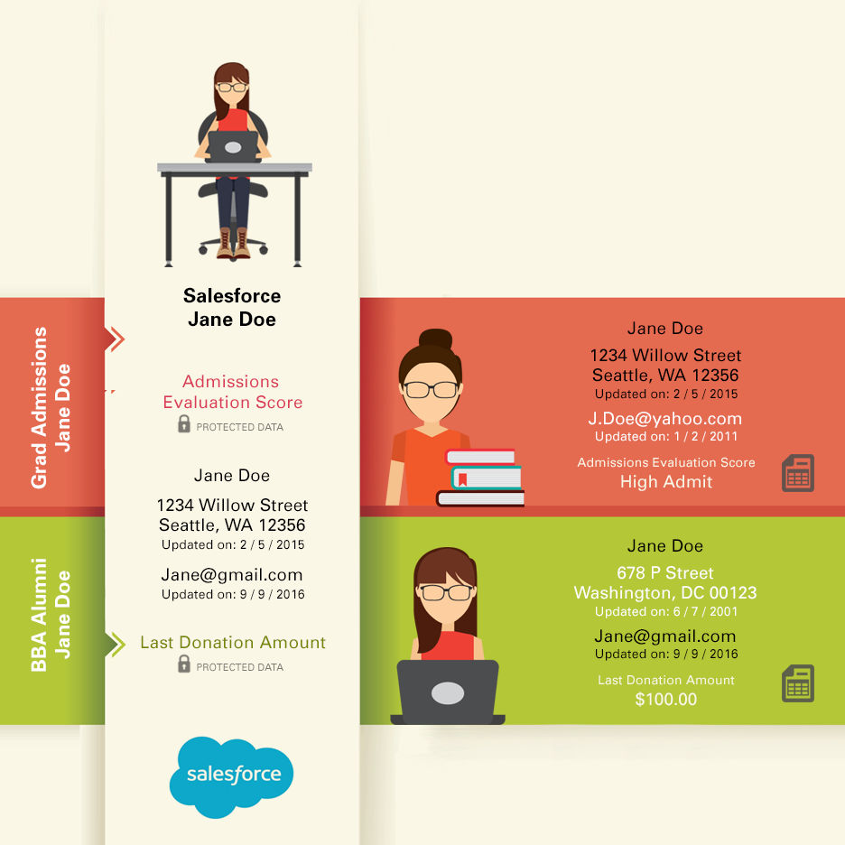 Today, Ross admissions units have their own siloed data for prospective students. Some of this data should be kept private, like admissions scores, but some data, like current email address, street address or phone could be shared across Ross, but is currently kept private. Ross alumni also has their own siloed data for alumni donors. Some of this data should be kept private like donor amounts, but some data, like most recent email address, street address or phone is also kept private.