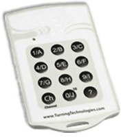 The TurningPoint "Clickers" are a light-weight card used to send responses to questions on a presentation. You can enter multiple choice answers as numbers or letters.