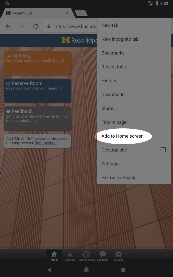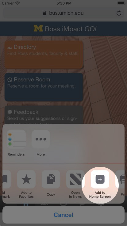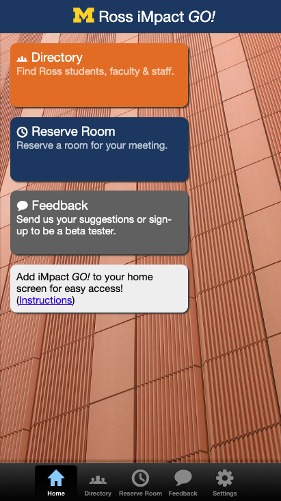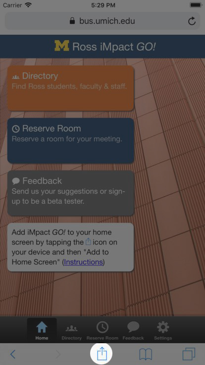 Do you need to reserve a study room quickly while on the go, or find your fellow classmates in the Ross Directory? The new iMpact GO! web app brings you quick and easy tools to manage your room reservations and connect with other members of the Ross community while on the go.